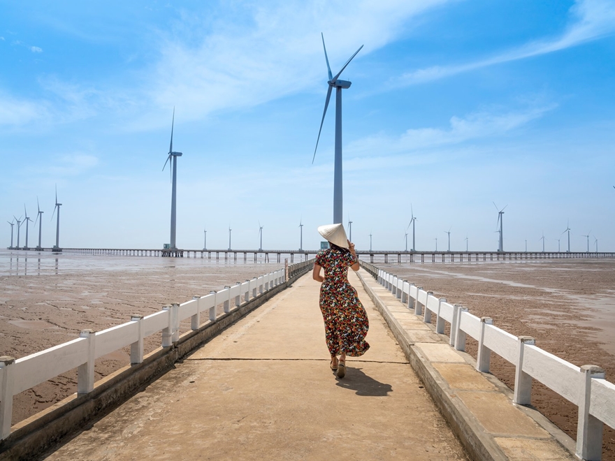 Buổi sáng, khởi hành tham quan Khu du lịch điện gió Hòa Bình, ngắm cảnh rừng ngập mặn, khám phá bãi bồi miền Tây và cùng check-in những cánh quạt gió vươn cao giữa nền trời rực rỡ cùng hình ảnh lá cờ Tổ Quốc bay phấp