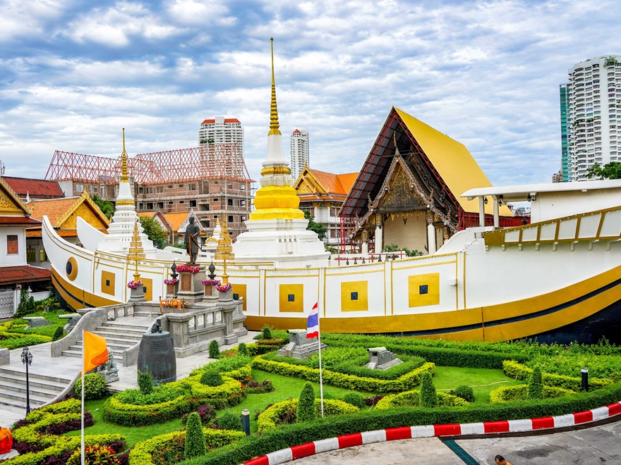 - 12:00 PM: Di chuyển về trung tâm Bangkok - viếng thăm Wat Yannawa - nằm bên bờ sông Chao Phraya River tại quận Sathorn của Bangkok. Ngôi chùa gây ấn tượng mạnh với du khách nhờ kiến trúc hình con thuyền buồm Trung Hoa rất đặc biệt.