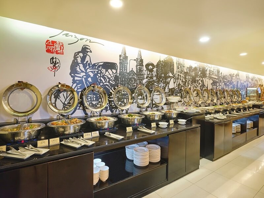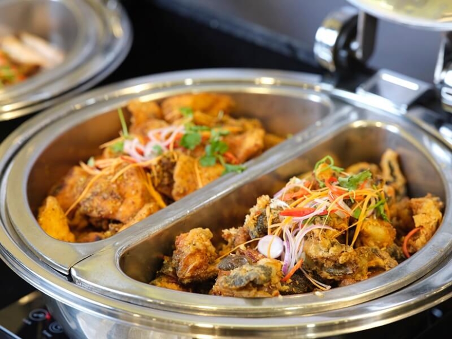 - Tiệc buffet còn đem đến cho bạn những món khai vị thơm ngon và không kém phần hấp dẫn với các món gỏi như: gỏi bồn bồn tôm thịt, gỏi bầu cá lóc nướng/chiên, gỏi rong biển sụn thịt xá xíu; bánh tráng các loại: bánh phồng, bánh đa nướng; các loại bánh truyền thống như: bánh đúc, bánh ít trần, bánh bột lọc, bánh nậm, bánh ướt, bánh hỏi… mang đậm hương vị miền quê và các món khác như gỏi cuốn, salad, sushi rau củ 5 loại, bắp Mỹ, ba khía trộn… cũng rất đáng để trải nghiệm.Các món cá cũng khá đa dạng như cá cháy tiêu đen, cá nướng giấy bạc, lườn cá Hồi nướng… Lẩu tự chọn cũng khá đa dạng cho bạn lựa những món lẩu chua cay, lẩu mặn, lẩu ngọt thanh… với các loại rau, nấm, bông hẹ, bông bi, nấm kim châm, dậu hũ, cá cờ, mì trứng, mì sữa, bún tươi, bánh phở, bún Tàu… dễ ăn, nước dùng đậm đà. Các món cơm như cơm chiên hải sản, cơm chiên thập cẩm… cũng dễ dàng mang lại hương vị quen thuộc như “cơm nhà”.
