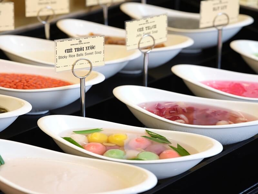 - Kết thúc bữa ăn, bạn dùng tráng miệng với các loại chè, bánh lọt sương sáo, mũ trôm mũ gòn, bánh ngọt Âu - Á, trái cây 4 mùa và dùng thức uống như trà đá, trà hoa cúc, nước sả… và đầy đủ các loại thức uống khác mang đến bữa ăn tròn vị cho thực khách.