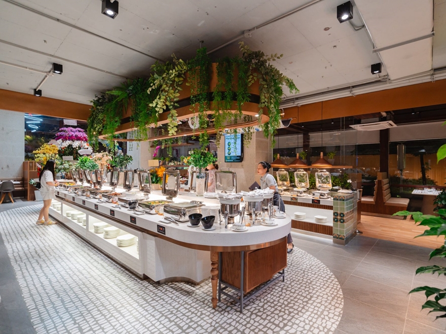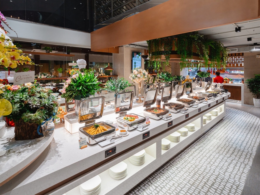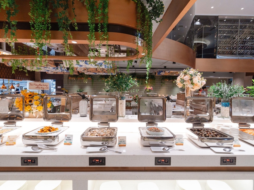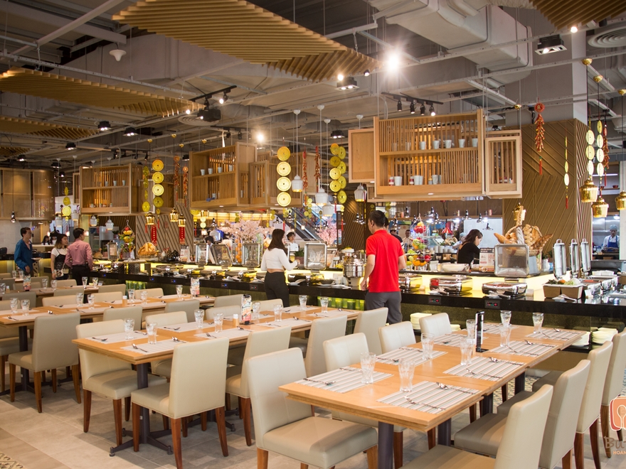 - Kiến trúc mở mang lại cảm giác thoải mái, giúp thực khách có thể vừa thưởng thức món ăn, vừa tận hưởng những cuộc trò chuyện thân mật bên gia đình và bạn bè. Những chi tiết trang trí tinh tế trên trần nhà cùng sự sắp đặt bàn ghế hài hòa đã tạo nên điểm nhấn độc đáo, khiến nơi đây trở thành một trong những địa điểm buffet được yêu thích nhất tại Sài Gòn.